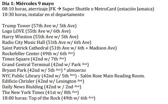 Por ejemplo: Si quieres ir a conocer el distrito comercial (Wall Street), trata de organizar todos los lugares cercanos que tienes en mente: