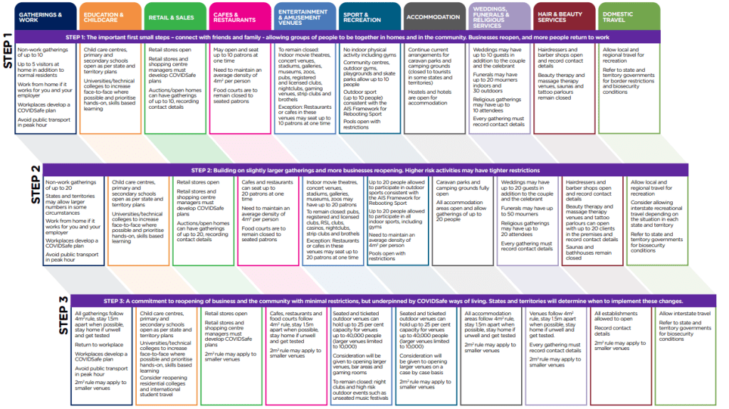 El 7 de mayo 2020, el Prime Minister Scott Morrison habló en conferencia de prensa y mencionó los pasos para volver a la normalidad. El lunes 11 de mayo 2020 empezó la primera: