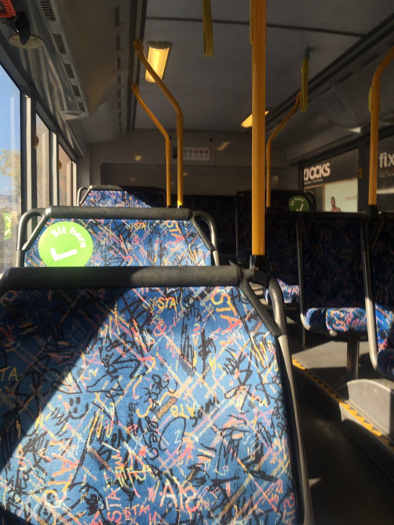 - Hay stickers en los buses para que se respete la distancia social y la gente se siente en los logos verdes «Sit here».