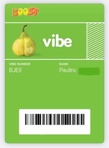 Tienes que descargar la aplicacion de Boost y tener tu tarjeta Vibe. Con ello podras obtener diferentes beneficios entre esos, sumar puntos cada vez que compras y scaneas tu tarjeta y al completar 8 tienes uno gratis. Y, además, podrás cobrar el jugo o smoothie que elijas el dia de tu cumpleaños (un dia antes y un dia después tambien funciona, pero es solo uno).
